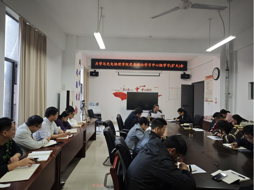 10月27日下午,力学与光电物理学院在明道楼A320会议室举行党委理论学习中心组学习(扩大)会。本次集体学习,围绕党的二十届四中全会公报、《习近平谈治国理政》、学习贯彻习近平总书记关于教育、科技创新、人才工作的重要论述,学习贯彻习近平总书记考察安徽重要讲话精神等主题进行深入学习研讨。党委书记孙东升主持学习会并作总结讲话,学院领导班子成员、党委委员、纪委委员、各党支部书记、全体辅导员、办公室秘书参加会议。