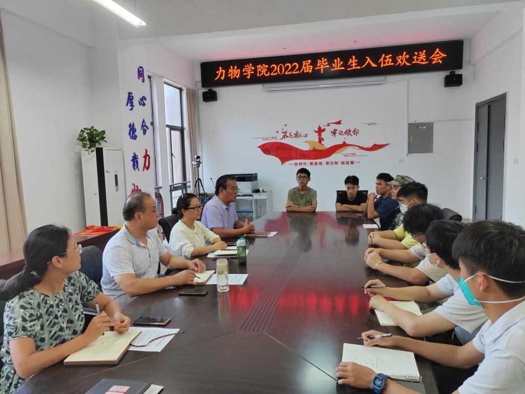 9月6日上午,力物学院举办2022年秋季大学生应征入伍欢送会,温馨送别2022届入伍毕业生,学院领导班子、2023届毕业生代表、辅导员等参加了会议。会议由党委副书记孙东升主持。