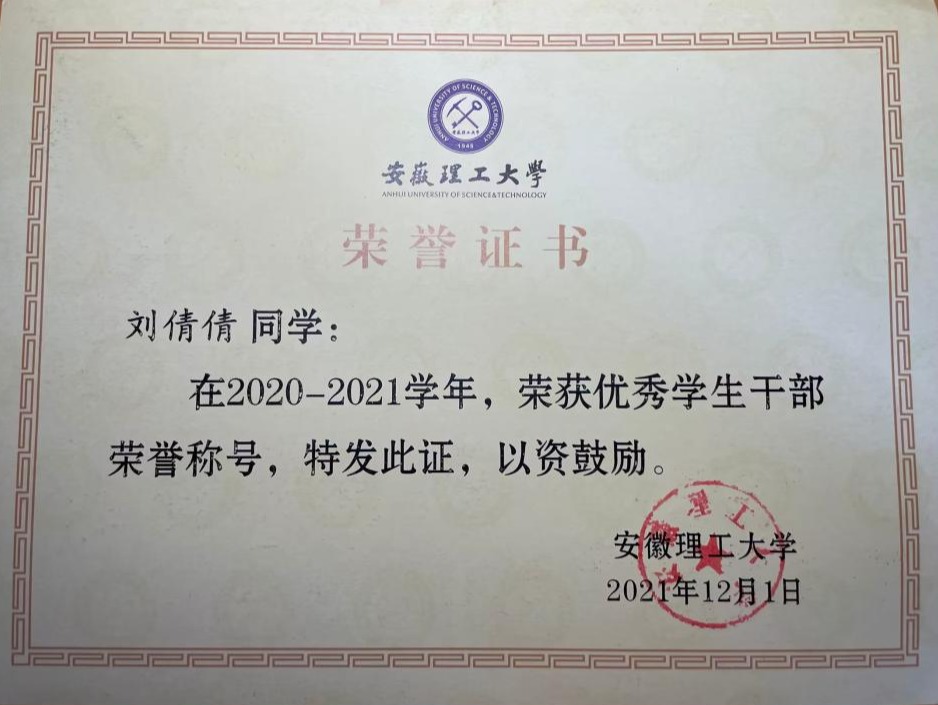刘倩倩,光电信息19-1学习委员,中共党员,励志奖学金获得者,三好学生,优秀学生干部。该生获得硕士研究生推免资格,顺利录取西安电子科技大学光学工程专业。