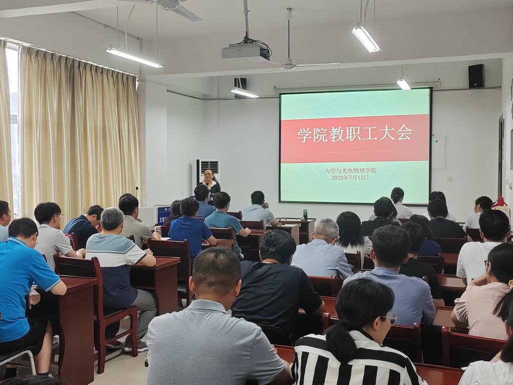7月12日下午,力学与光电物理学院期末教职工大会在明道楼A321报告厅顺利召开。学院领导班子成员及全体教职工参加了大会。会议由学院党委书记刘艳主持。
