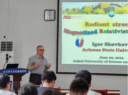 应科研部、力学与光电物理学院及基础物理研究中心邀请,6月20日上午,美国亚利桑那州立大学Igor Shovkovy教授来力物学院做学术交流,并作题为《Radiant strongly magnetized relativistic plasmas》的学术报告。报告会由学院主要负责人主持,学院领导对Shovkovy教授的到来表示热烈欢迎,学院部分教师、研究生及基础物理研究中心成员参加了报告会。