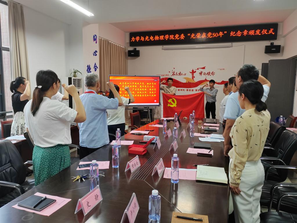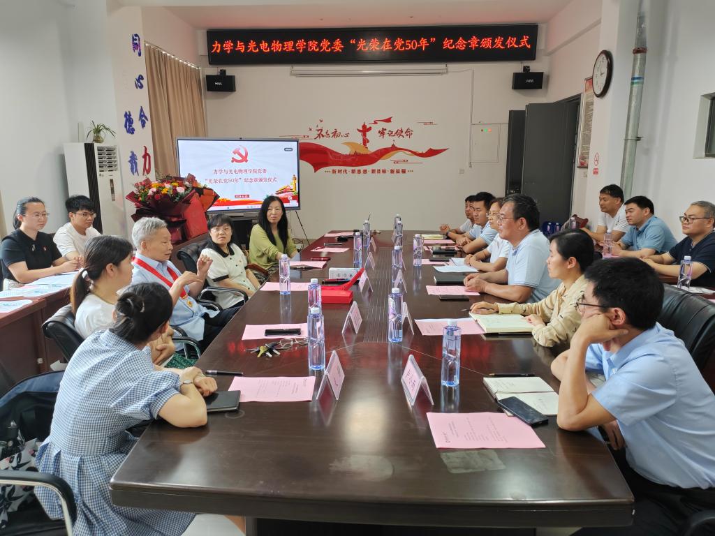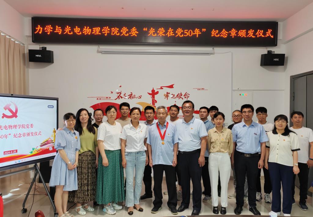 6月28日下午,力学与光电物理学院党委“光荣在党50年”纪念章颁发仪式在明道楼A320会议室隆重举行。学院领导班子、“光荣在党50年”退休党员教师王晋平、基础力学系及工程力学系部分党员教师参加仪式。仪式由学院党委书记孙东升主持。