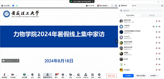 8月18日晚上,为进一步扩大家访范围,力物学院开展暑期线上集中家访座谈会。学院领导、专职辅导员以及500余位家长代表出席本次会议。会上,学院学工干部结合自身工作实际,分别从大学生资助政策、宗教政策、征兵政策、学生日常管理、党团员发展、心理健康教育以及24级新生生活学习规划等多方面进行介绍,鼓励同学们假期进行合理的学习规划。在家校互动交流环节中,听取了学生家长对学校、学院教育管理工作的意见和建议,并针对学生家长所关心的升学就业等方面的问题进行了耐心细致的解答。