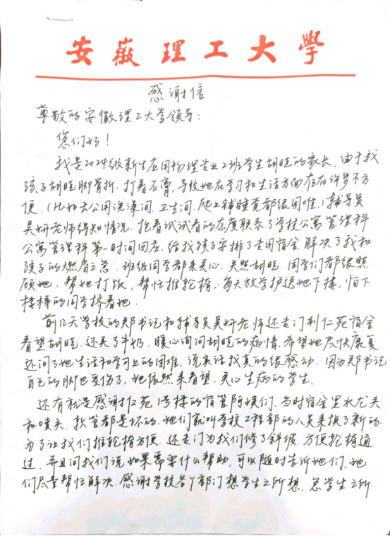 11月4日,安徽理工大学力学与光电物理学院收到了一封来自学生家长的感谢信,字里行间满是真挚的感谢之情,诉说着这样一个故事。