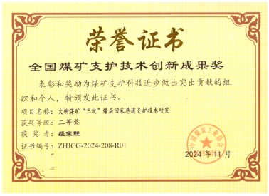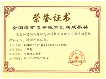 由我校力学与光电物理学院经来旺教授主持完成的《大柳煤矿“三软” 煤层回采巷道支护技术研究》项目荣获“全国煤矿支护技术创新成果二等奖”,我校经来旺教授荣获“全国煤矿支护优秀专家”荣誉称号。