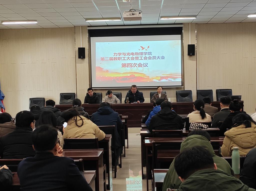 1月13日上午,力学与光电物理学院在明道楼一楼报告厅召开二届四次教职工大会暨工会会员大会。学院领导班子成员、全体教职工参加会议。会议由学院党委书记孙东升主持。