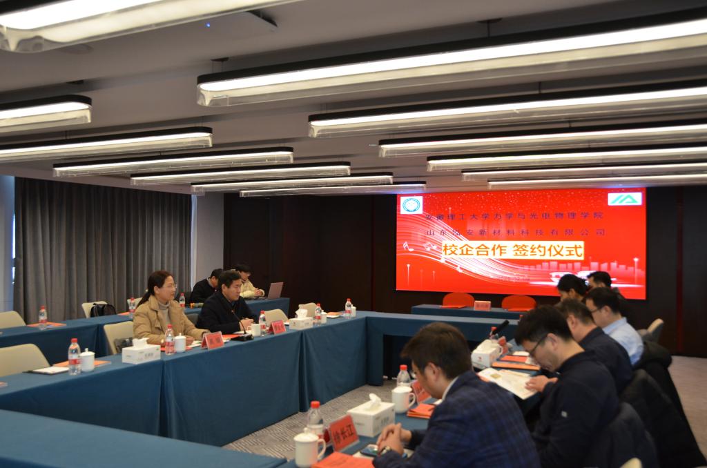 2月9日,安徽理工大学力物学院与山东泓安新材料科技有限公司举行产学研签约及研究生联合培养基地揭牌仪式。力物学院常务副院长高娟和工程力学系主任罗吉安,兖州区政协副主席戴宪亭,兖州区科技局党组书记、局长武云飞,漕河镇党委副书记、镇长赵庆丽,党委委员、副镇长徐松岩,镇科技办主任桑广友,山东泓安新材料科技有限公司总经理徐长江等人出席仪式。