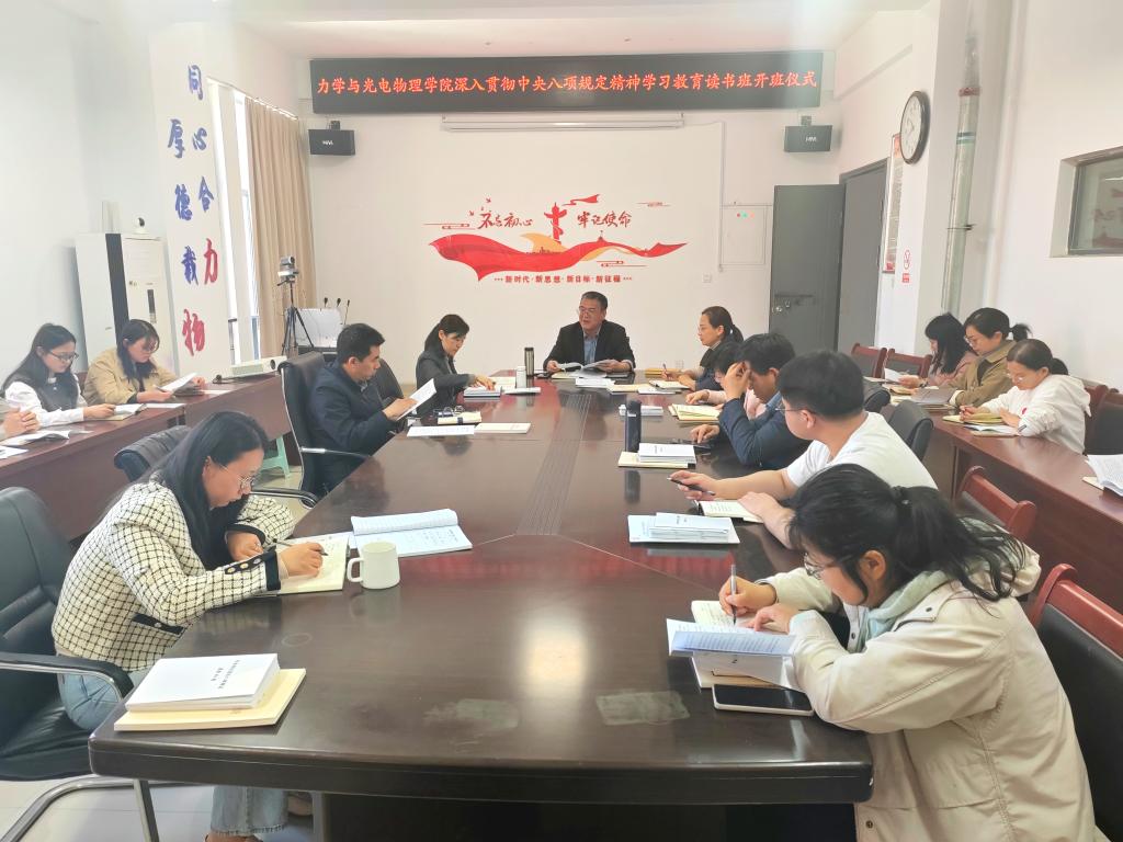 4月14日下午,力学与光电物理学院深入贯彻中央八项规定精神学习教育读书班在明道楼A320会议室举办开班式,学院领导班子成员、党委委员、纪委委员、党支部书记、支部纪检委员、院办秘书、辅导员参加开班仪式。