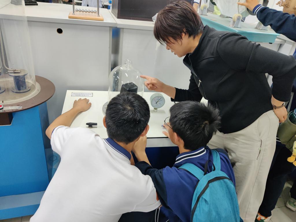 在百川楼科普展厅,力物学院教师及志愿者团队为淮南市部分中学初中生走介绍科普设备和科普知识。学生通过实验体验,感受物理魅力,点燃科学探索热情,播下科技梦想种子。