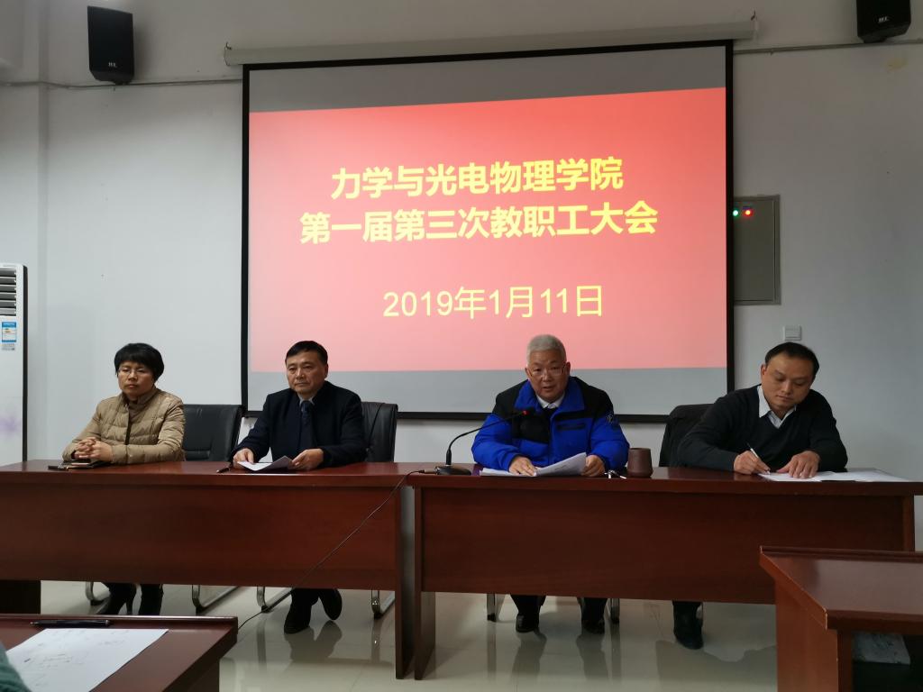 1月11日下午,力学与光电物理学院在三楼报告厅召开一届三次教职工大会,学院党政领导班子成员及全体教职工参加大会。开幕式由学院党委书记石秀光主持。