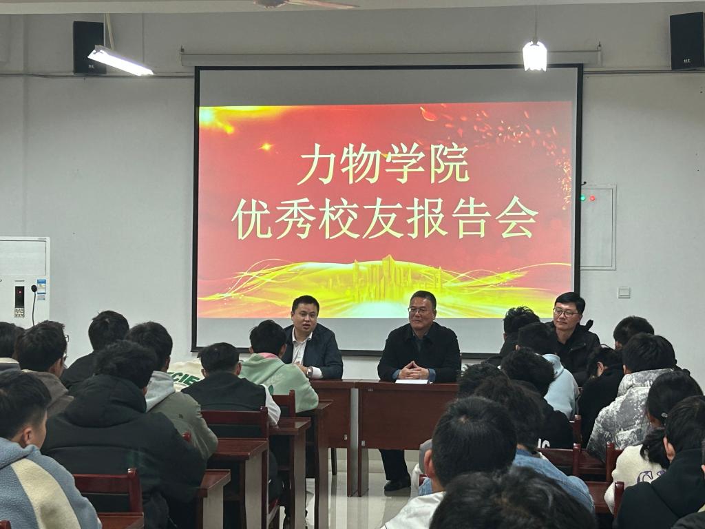 为加强校友与学院之间的联系,彰显优秀校友的榜样力量,激发2022级新生奋发图强的斗志,3月18日下午,力物学院在明道楼A321报告厅顺利举行了优秀校友报告会。本次报告会邀请了两位工程力学专业优秀校友张伟和胡宝山给同学们进行经验分享。学院党委副书记孙东升、2022级辅导员和2022级工程力学专业新生参加此次报告会,报告会由孙东升主持。