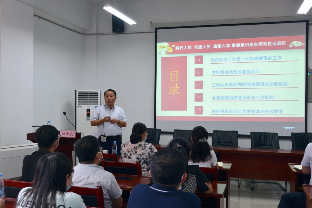 9月2日下午,力物学院在明道楼报告厅举办意识形态工作专题辅导报告会,校党委宣传部、统战部常务副部长田中良作了《胸怀大局、把握大势、着眼大事,牢牢把握意识形态领域领导权话语权》的辅导报告。力物学院党委理论学习中心组成员、科级干部、全院教职工参加了报告会。学院党委书记刘艳主持会议。