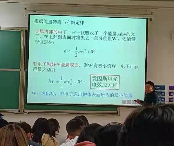教学示范课由公共物理系程东超老师主讲。程东超老师以《大学物理》课程中“光的量子性”为讲授内容,从研究光电效应的实验讲起,讲解了光电效应的实验规律、经典理论遇到的困难、光电效应的理论解释、引出爱因斯坦光电效应方程。全程采用启发式讲授、问题式探讨等方法进行教学,程东超老师循序渐进地导入问题,内容讲解透彻,思路清晰,重点难点突出,教态自然,精神面貌好,课堂管理好,展示出扎实的教学功底和较强的课堂掌控能力。