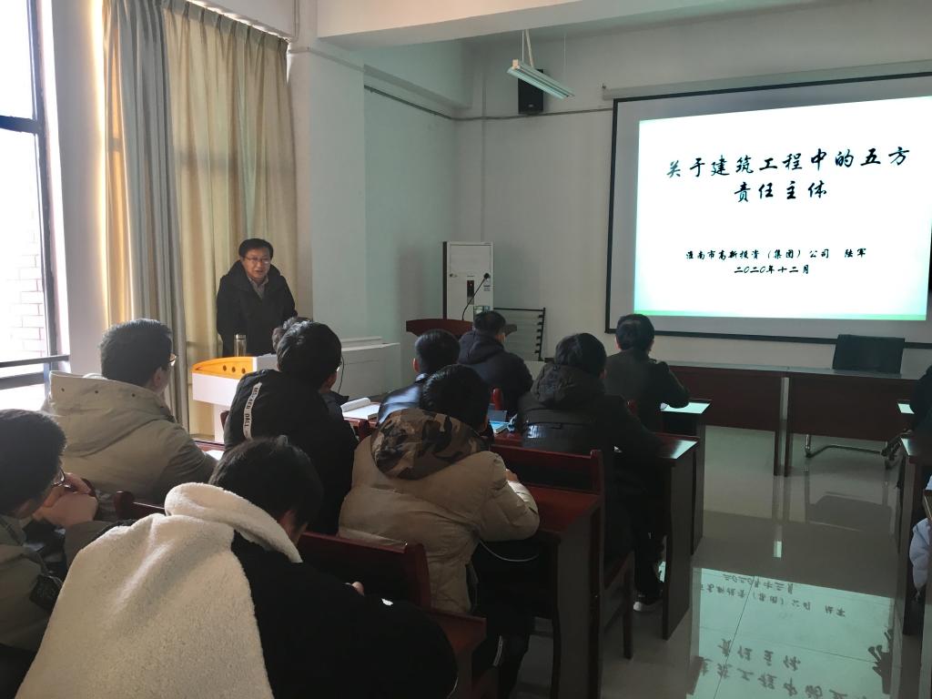 应自然科学处和力学与光电物理学院邀请,12月16日下午,淮南市高新投资(集团)有限责任公司董事长陆军来力物学院作学术交流,并在院报告厅作题为《建筑工程实施过程中的五方责任问题》的学术报告。报告会由院长经来旺教授主持,部分青年教师以及工程力学专业本科生共计80余人参加了报告会。