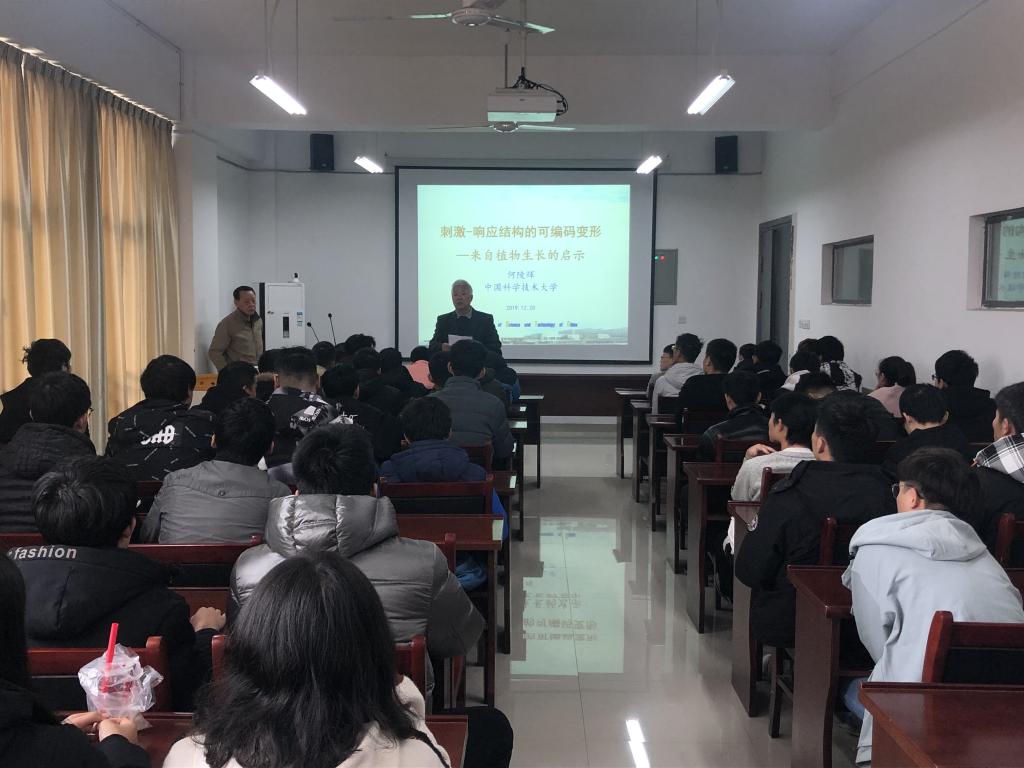 应自然科学处和力学与光电物理学院邀请,12月20日下午,中国科学技术大学何陵辉教授在学院报告厅作了题为《刺激—响应结构的可编码变形》的学术报告。报告会由力物学院院长经来旺教授主持,工程力学专业本科生和部分青年教师约90人聆听了报告会。