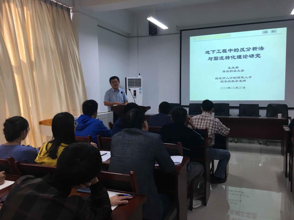 应自然科学处和力学与光电物理学院邀请,10月20日下午,青岛科技大学王永岩教授在学院报告厅作了题为《地下工程中的反分析法及固流转化理论的研究》的学术报告。报告会由院长经来旺教授主持,力学专业年青教师、研究生及部分本科生60余人聆听了报告会。