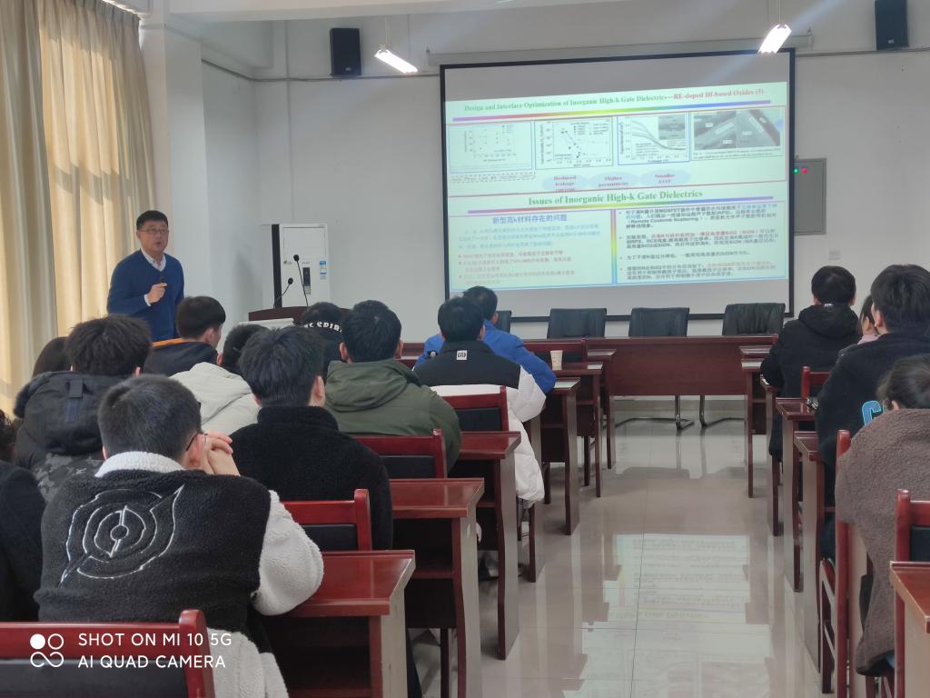 何刚教授介绍了集成电路及高k栅介质的研究背景及其课题组在硅基高k栅材料选择和界面修饰方面的研究工作,针对高k栅介质本身的缺陷及硅基的服役周期物理问题,进一步介绍了课题组在高迁移沟道材料与高k栅异质集成方面的研究工作。他结合新型高k栅的优势,介绍了课题组目前在薄膜晶体管方面取得的研究进展。