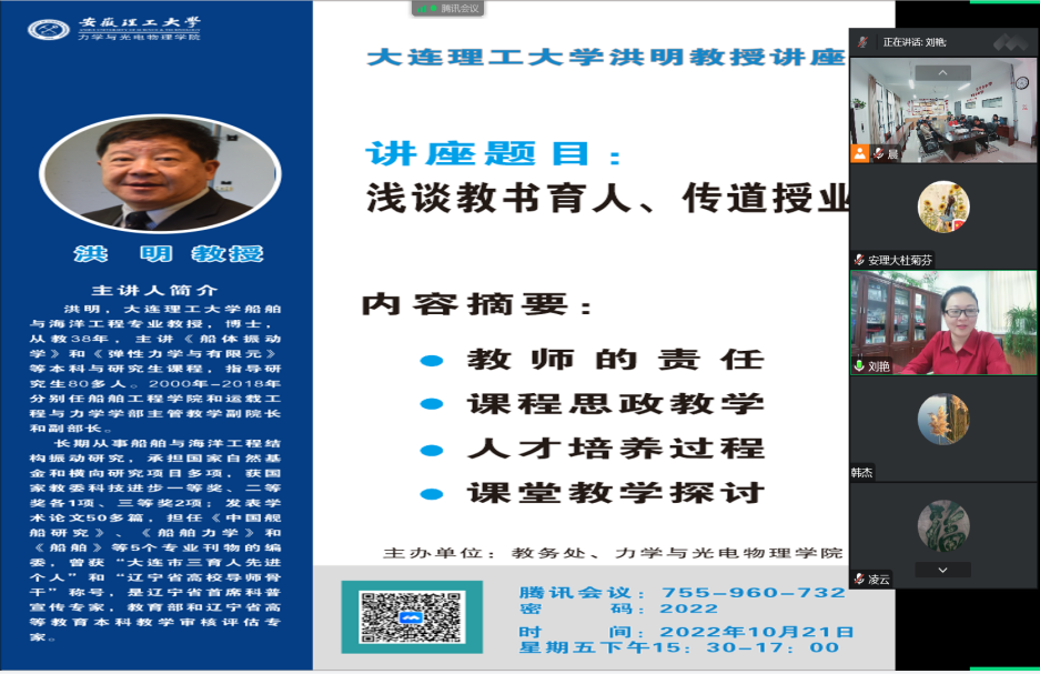 应教务处、力学与光电物理学院的邀请,10月21日下午,大连理工大学洪明教授为我校教师作了题为《浅谈教书育人、传道授业》的线上报告。报告会由力学与光电物理学院党委书记刘艳主持。