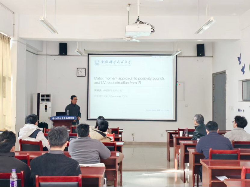 应科研部、力学与光电物理学院及基础物理研究中心邀请,2025年12月5日上午,中国科学技术大学物理学院教授周双勇在明道楼A321报告厅作题为《Matrix moment approach to positivity bounds and UV reconstruction from IR》的学术报告。报告会由力物学院院长王群主持,学院部分教师和研究生参加了此次报告会。