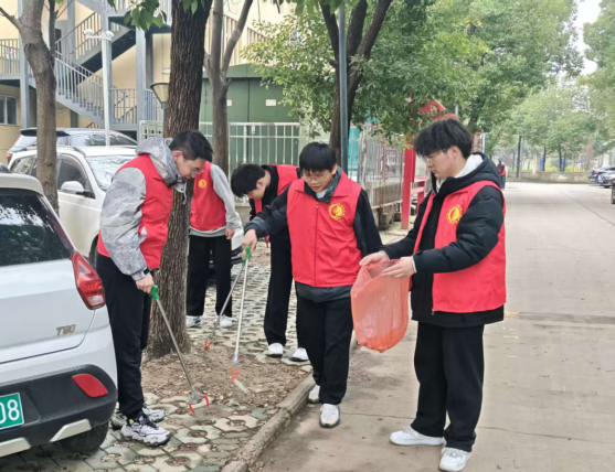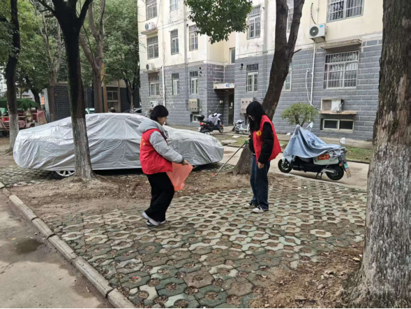 活动当天,志愿者准时抵达社区,迅速领取工具并分为三组展开行动。一组沿主干道清理落叶、烟头等垃圾,细致夹取缝隙中的杂物;一组深入草丛,重点清扫健身器材周边的零食包装袋和烟头,不留卫生死角;另一组对楼道口和垃圾桶周边进行集中清理。志愿者们不怕脏、不怕累,汗水浸湿衣衫仍热情不减,用实际行动诠释奉献精神。
