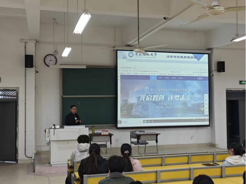 学院邀请本院李洋教授、刘文震、符青山三位老师担任主讲嘉宾。三位老师曾指导多项国家级、省级学科竞赛获奖,具备丰富的竞赛培训与实战经验。他们分别围绕“安徽省光电设计大赛”、“全国大学生物理实验竞赛”和“全国周培源大学生力学竞赛”为主题,向同学们详细介绍了赛事来历、参赛方式、我校往届获奖情况等竞赛相关内容。