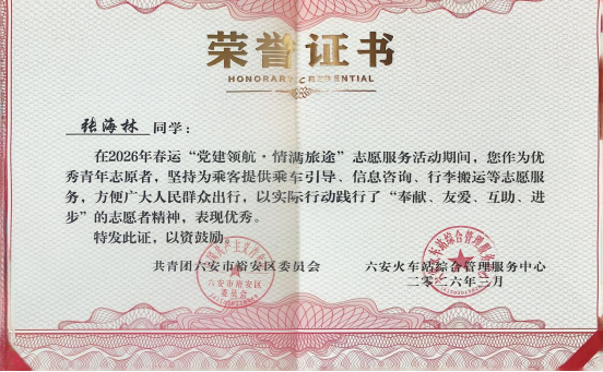 近日,力物学院收到了一个来自六安火车站的快递,内附感谢信和六安火车站精心准备的纪念礼品。这份感谢信记录着学院学子在春运期间的温暖坚守与奉献担当。据了解,春运期间,张海林主动响应“暖冬行动”号召,放弃寒假休息时间,化身春运志愿者,坚守在六安火车站综合管理服务中心一线,用耐心服务化解旅客归途难题,用青春担当温暖万千人心。以实际行动诠释了“奉献、友爱、互助、进步”的志愿精神,展现了新时代大学生的良好风貌。