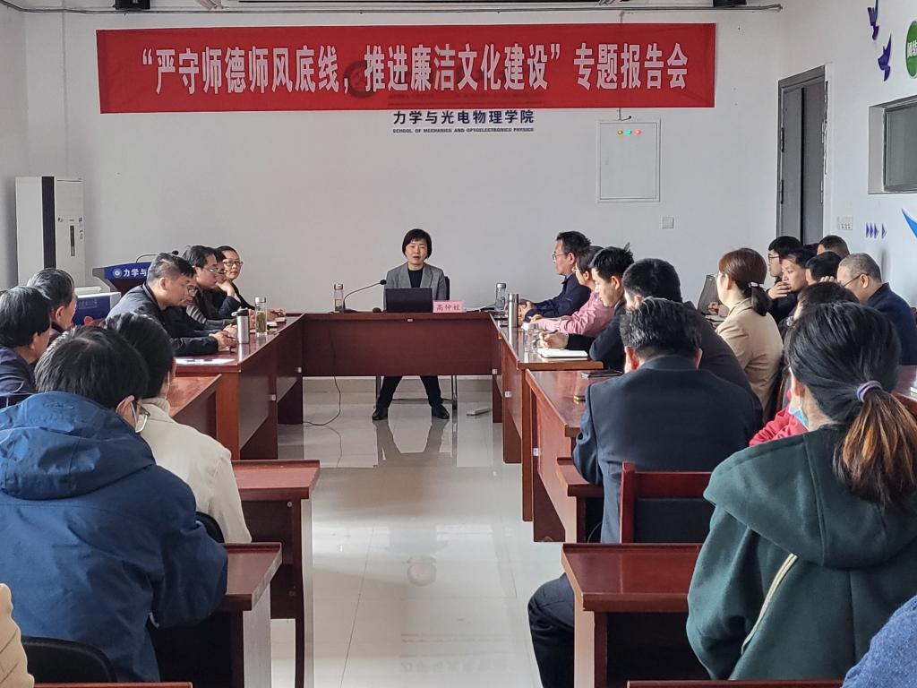 4月8日下午,力物学院邀请校纪委副书记、纪委办公室主任高仲姣,在明道楼A321报告厅为学院全体教职工作题为《严守师德师风底线,推进廉洁文化建设》的专题报告。报告会由学院党委书记刘艳主持。