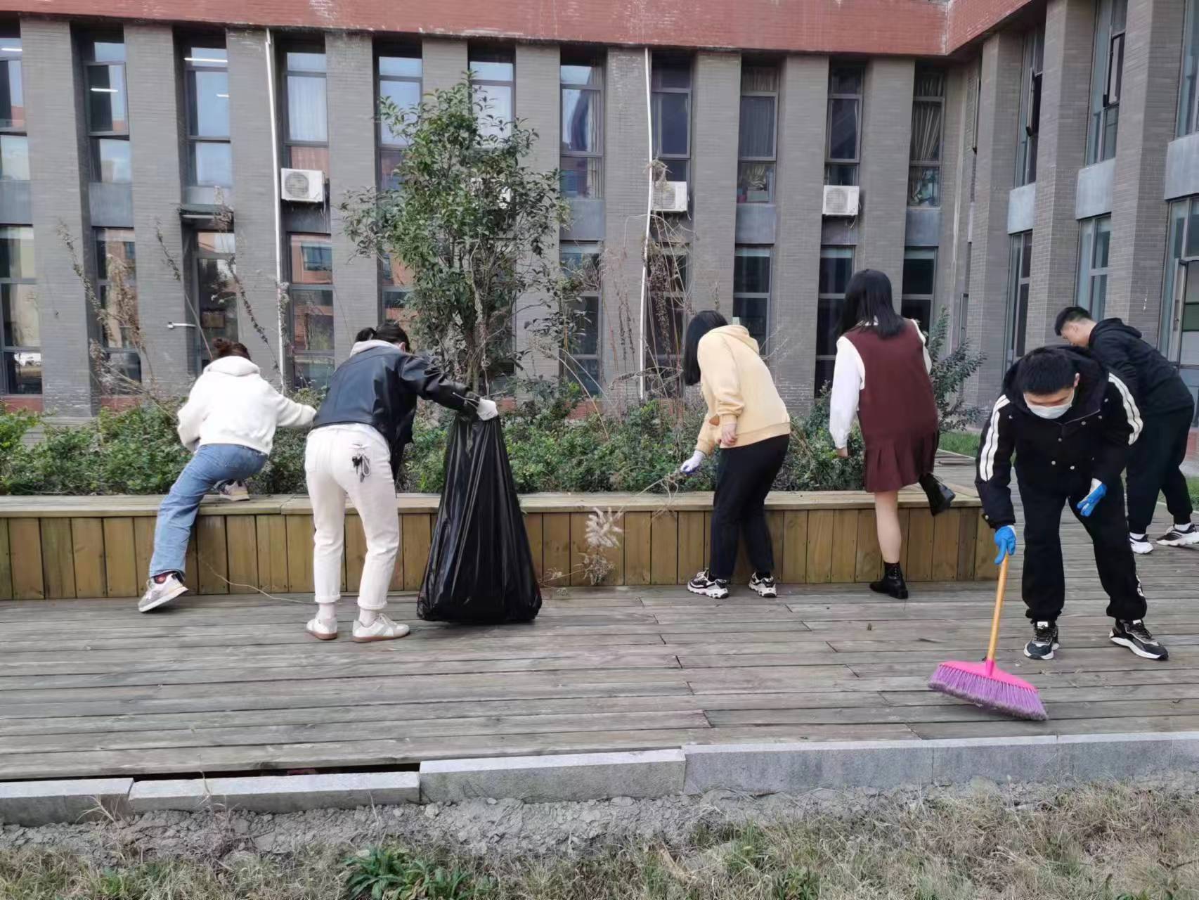 劳动现场,党员胸前的党徽熠熠生辉。师生们带着扫帚、手套等清洁工具,积极投身到杂草铲除、场地洒扫等劳动项目中,参与人员利用半天的时间全面清运明道楼后死角垃圾,清除外围场地杂草,整个场面繁忙有序。