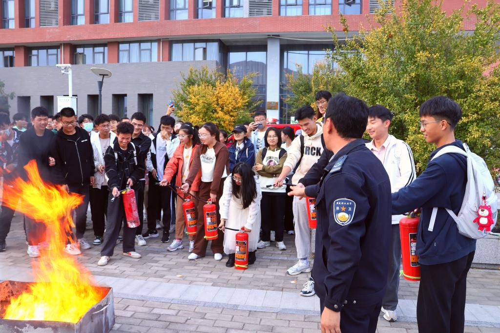 理论培训结束后,力物学院新生进行了现场灭火模拟演练,认真学习使用灭火器灭火的方法和技巧。
