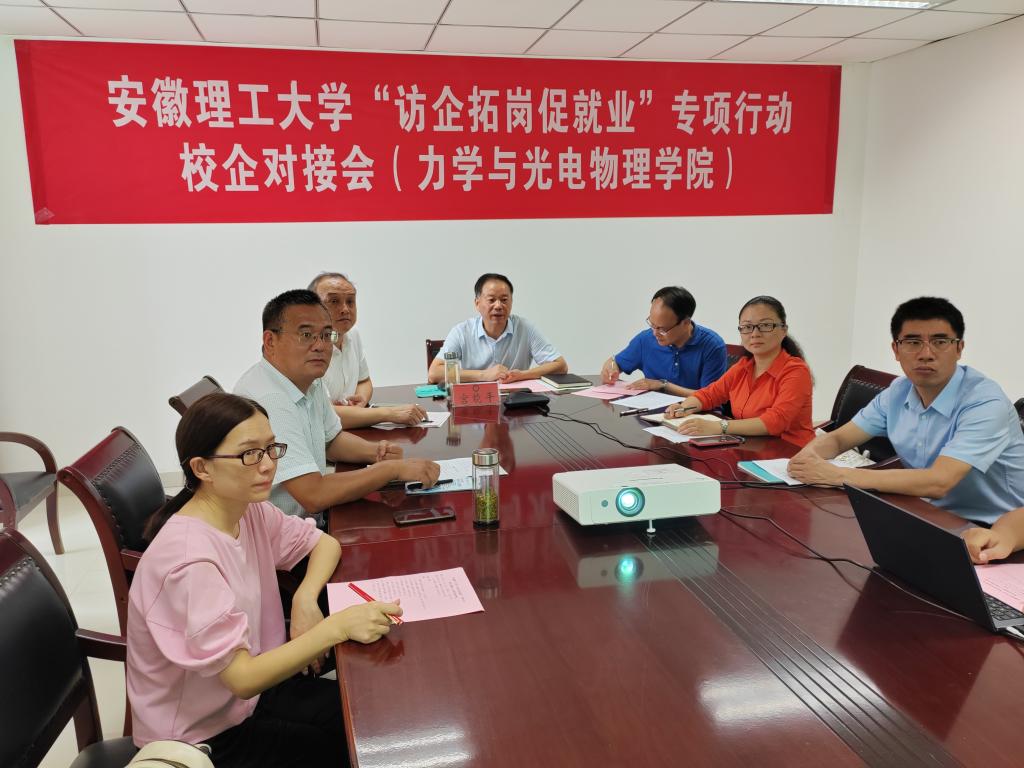 为深入贯彻落实党中央、国务院关于高校毕业生就业工作的决策部署,不断拓宽毕业生就业渠道,推动毕业生更高质量就业,进一步搭建校企合作平台,8月16上午,安徽理工大学“访企拓岗”专项行动校企对接会(力学与光电物理学院专场)在舜耕楼1103会议室举行。