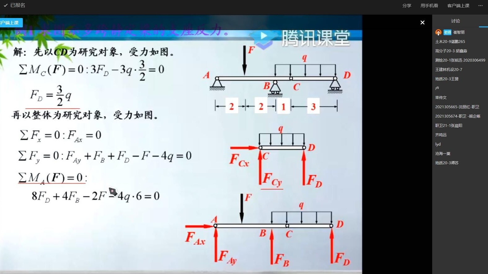 在2020级《工程力学》课程答疑中,基础力学系主任崔智丽老师就同学们的疑问耐心细致的做出回复。在课程学习方面她给予学生很好的建议,还就静力学中怎么选取研究对象、怎么画受力图、如何求解约束反力进行了详细讲解。