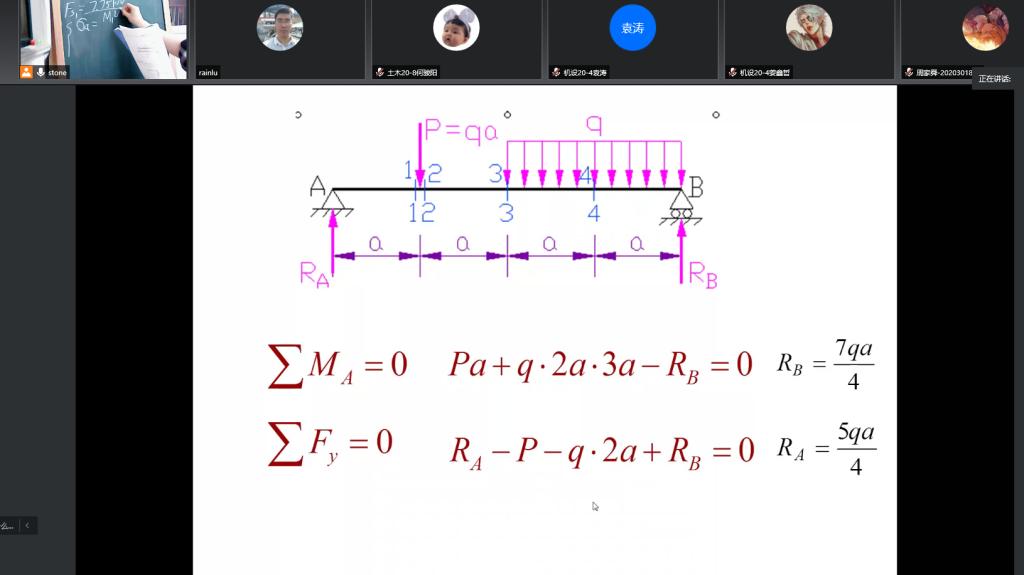 在2020级《材料力学》课程答疑中,基础力学系赵丽霞老师首先带领大家复习了剪力、弯矩和截面法的一些概念,并结合实例讲解了如何计算某些截面的剪力和弯矩,重点介绍了剪力图和弯矩图的画法。