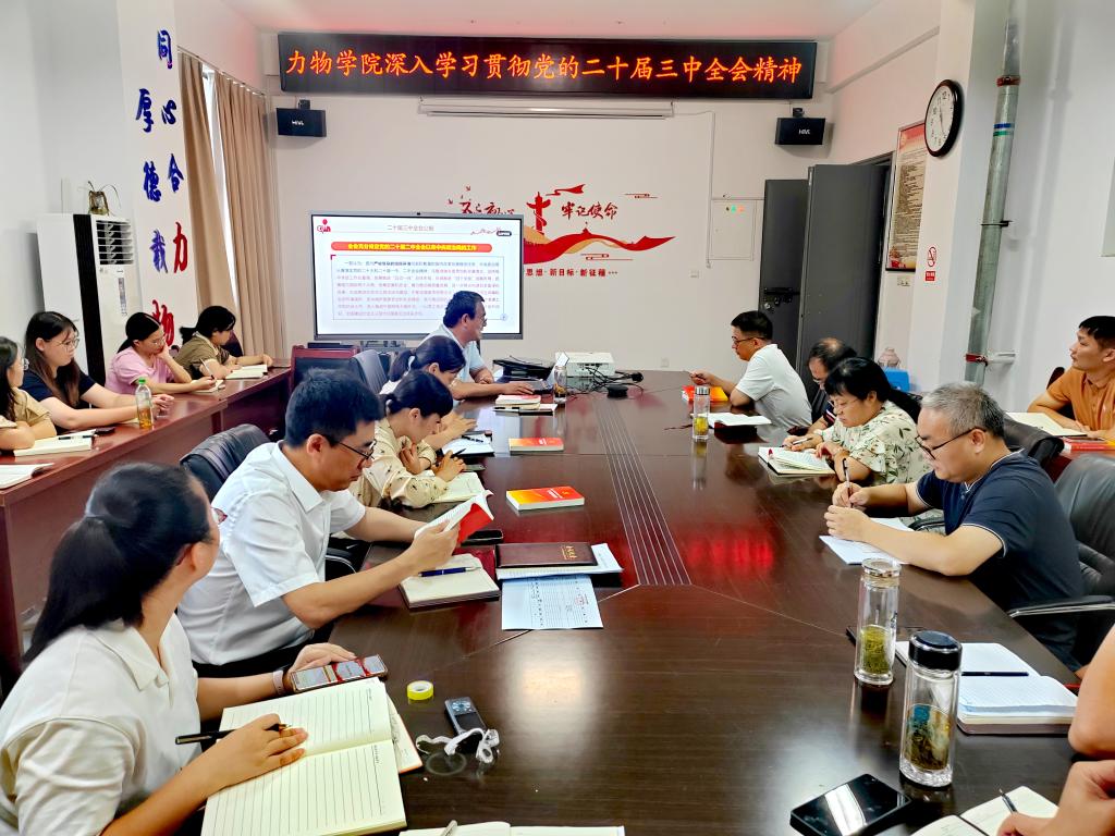8月27日下午,力物学院在明道楼A320会议室召开党委理论学习中心组(扩大)学习会,专题学习党的二十届三中全会精神。会议由学院党委书记孙东升主持,学院党政领导班子成员和各党支部书记、系主任、辅导员、相关秘书参加会议。
