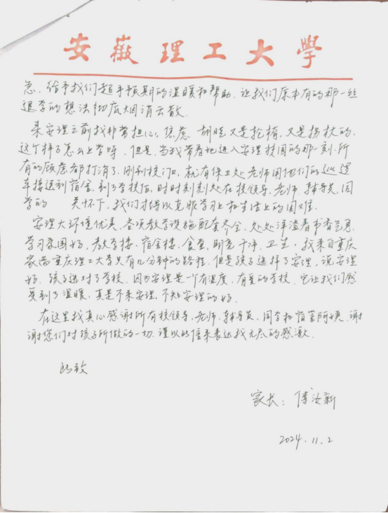 11月4日,安徽理工大学力学与光电物理学院收到了一封来自学生家长的感谢信,字里行间满是真挚的感谢之情,诉说着这样一个故事。