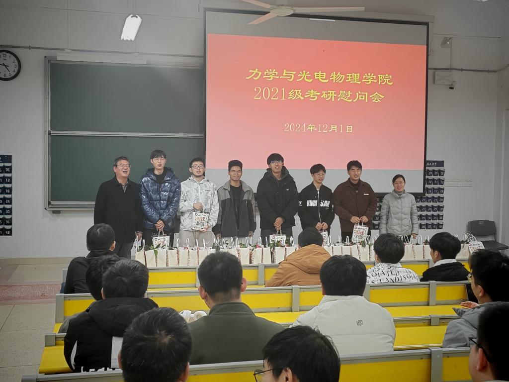 12月1日下午,在2025年硕士研究生入学考试即将来临之际,力物学院在明理南112教室举办考研慰问大会。学院党委书记孙东升、党委副书记郑孝莲、2025届毕业年级辅导员参加慰问活动,共同为考研学子送上温暖与祝福。