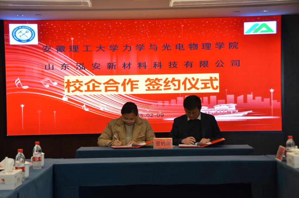 2月9日,安徽理工大学力物学院与山东泓安新材料科技有限公司举行产学研签约及研究生联合培养基地揭牌仪式。力物学院常务副院长高娟和工程力学系主任罗吉安,兖州区政协副主席戴宪亭,兖州区科技局党组书记、局长武云飞,漕河镇党委副书记、镇长赵庆丽,党委委员、副镇长徐松岩,镇科技办主任桑广友,山东泓安新材料科技有限公司总经理徐长江等人出席仪式。