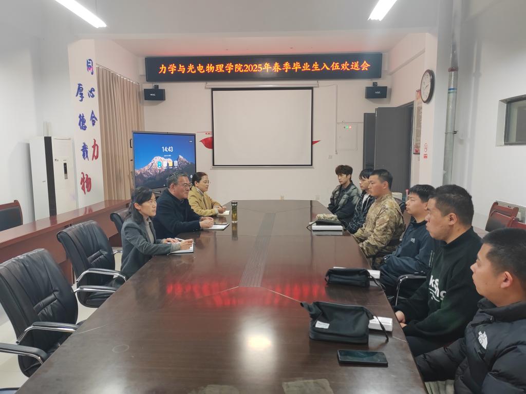 阳春三月送新兵,一身戎装踏征程。3月12日下午,力物学院在明道楼A320报告厅举行2025年春季大学生入伍欢送会,欢送学院即将启程奔赴军营的2名准新兵应届毕业生。学院党委书记孙东升、常务副院长高娟、党委副书记郑孝莲、毕业班辅导员、有应征意向的毕业班学生参加活动。