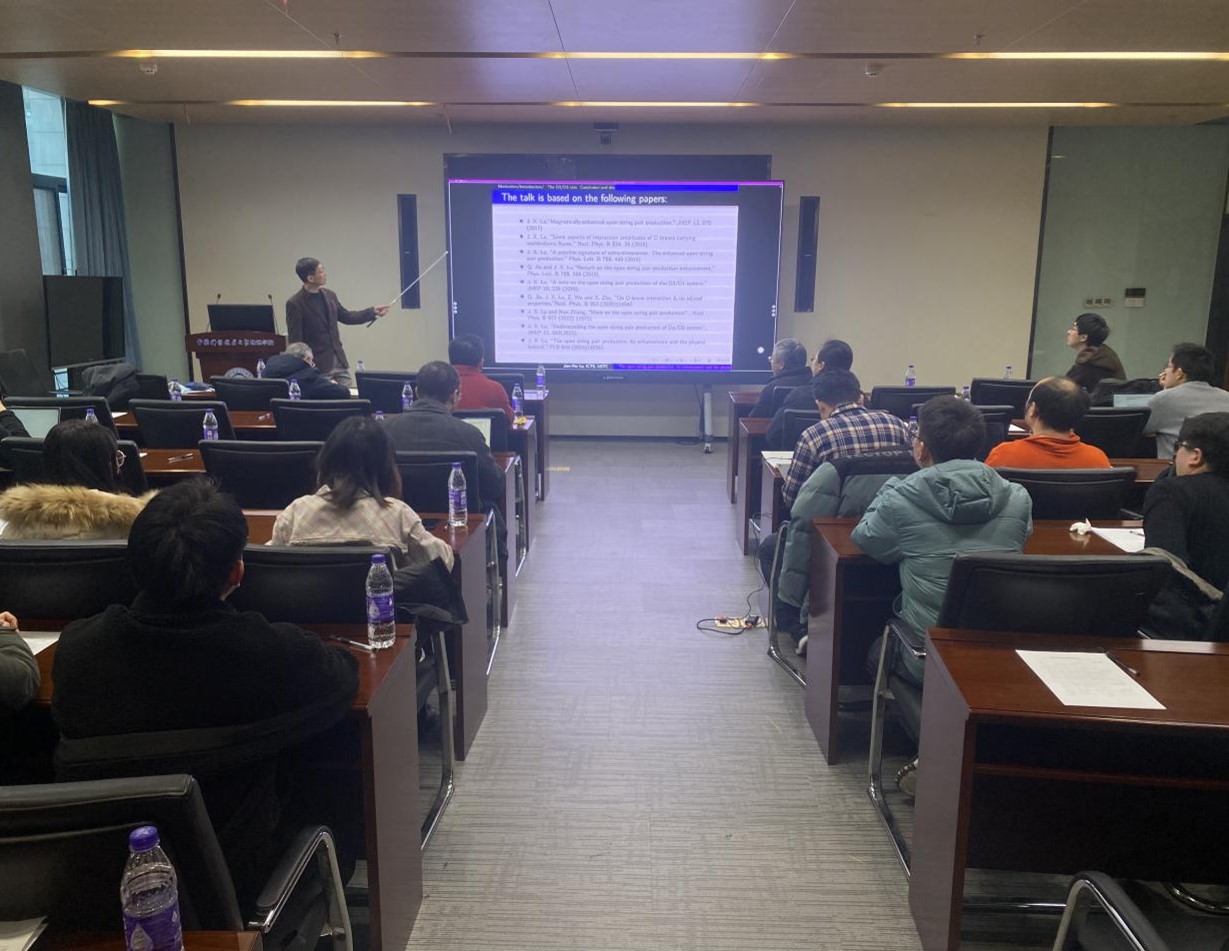 本次研讨会由大会报告和自由讨论两部分组成,共计14个口头报告,涵盖了微观量子引力与超弦理论、软物质和生物体系的非平衡物理理论、复杂量子系统中新奇物相和动力学理论、开放量子系统动力学、非平衡过程的量子信息处理和量子多体问题等议题。报告环节由王群教授、中国科学技术大学龚明教授、丁桂军教授和浦实教授主持。中国科学技术大学卢建新教授、周正威教授、何力新教授、高阳教授、龚明教授分别作题为《The open string pair production, its enhancement and the physics behind》、《基于光学人工维度的模拟与调控》、《第一性原理计算软件ABACUS介绍》、《自旋输运中的昂萨格对易与几何相位》和《Bosonization and 1d Physics-A brief introduction》的特邀报告。来自我校的参会代表分别做了九场报告。报告精彩纷呈,与会代表积极交流探讨,研讨会现场学术氛围浓厚、气氛热烈。会议于26日下午闭幕,王群教授致闭幕辞。