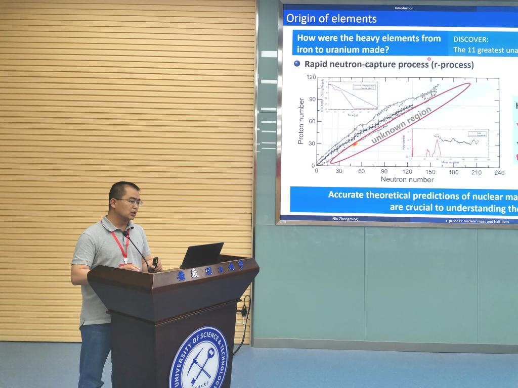 23号下午-25号上午的学术会议由大会报告和自由讨论两部分组成,共计九个学术报告,报告环节由王群教授、中山大学林树教授、中国科学技术大学林子敬教授、华中师范大学侯德富教授主持。中国科学技术大学林子敬教授、易为教授、大连理工大学付伟杰教授、安徽大学郭建友教授、牛中明教授、华中师范大学侯德富教授、中山大学林树教授、中国科学院固体物理所杨勇研究员、中国科学技术大学龚明教授分别作《基于图深度学习加速的晶体结构预测方法发展》、《Simulating Non-Hermitian Physics》、《Ripples of the QCD critical point》、《开放量子系统的理论发展与奇特核研究》、《r-过程研究中原子核质量与β衰变寿命的理论描述》、《极端条件下的QCD物质》、《Polarization Dynamics in Paramagnet of Charged Quark-gluon Plasma》、《量子隧穿和最小空间尺度的存在性》和《准周期模型中的安德森局域化和临界相》的精彩报告。并同与会专家、师生进行了积极交流探讨。会议现场学术氛围浓厚、气氛热烈。会议于25日上午闭幕,王群教授致闭幕辞。