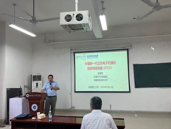 2024年7月12日下午,应中心邀请,中国科学技术大学物理学院博士生导师、国家优秀青年基金获得者、国家杰出青年基金获得者、国家科技领军人才入选者彭海平教授访问我校,并做了题为《中国新一代正负电子对撞机——超级陶粲装置(STCF)》”的主题报告。本次报告是安徽理工大学“舜耕大讲堂”系列学术活动之一,由科研部、机电学院、力物学院和基础物理研究中心共同举办,报告由王群教授主持,机电学院、力物学院师生及中心部分成员参加了此次报告会。