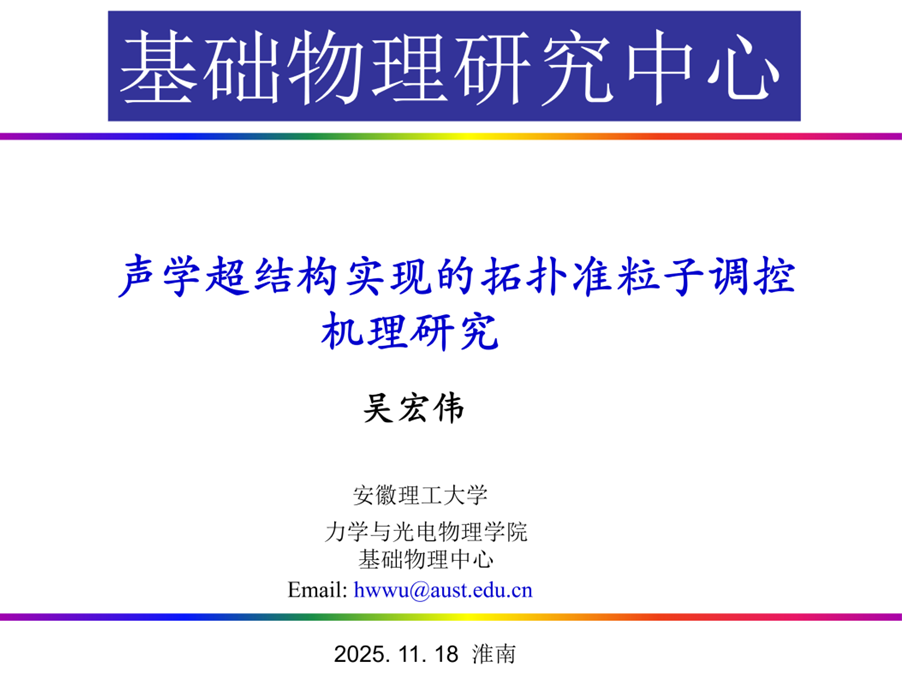 11月18日晚,基础物理中心举行《2025系列学术报告》第十四期,安徽理工大学基础物理研究中心吴宏伟教授,就题为“声学超结构实现的声斯格明子模式调控”做了学术报告。报告会由眭陶陶主持,中心成员及学院部分老师参加了报告会。