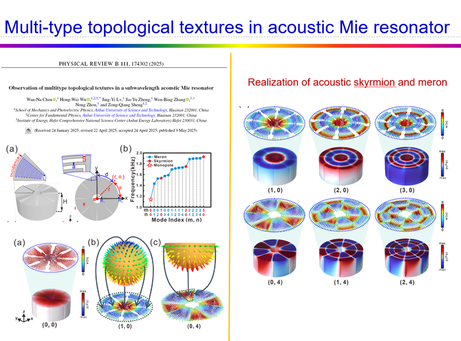 基于这一背景,吴宏伟首先介绍了其课题组在声学超结构上实现的速度场矢量、自旋场矢量产生的斯格明子以及半子等拓扑准粒子纹理结构。以此为基础,吴宏伟进一步介绍了他们如何通过局域共振型声学超结构的耦合实现声学斯格明子模式的接力传输、非辐射耦合传输的研究工作。