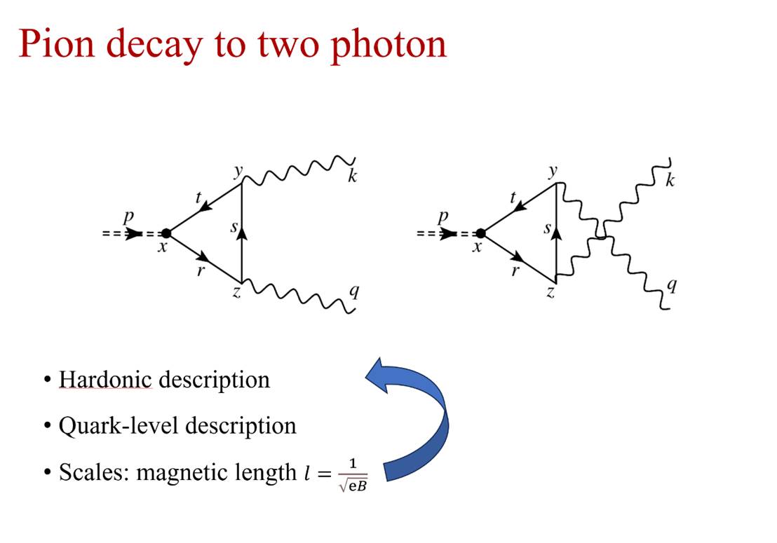 在报告中,王昕杨教授详细介绍了研究团队在强子框架下对π⁰→γγ衰变过程的创新分析。通过质子三角图和有效Yukawa耦合模型,团队首次系统推导了弱磁场对衰变率的二阶修正表达式。研究显示,磁场会普遍抑制衰变率,即使对于重离子碰撞中典型的强磁场,修正也仅为0.02%,效应虽小但具有理论意义。